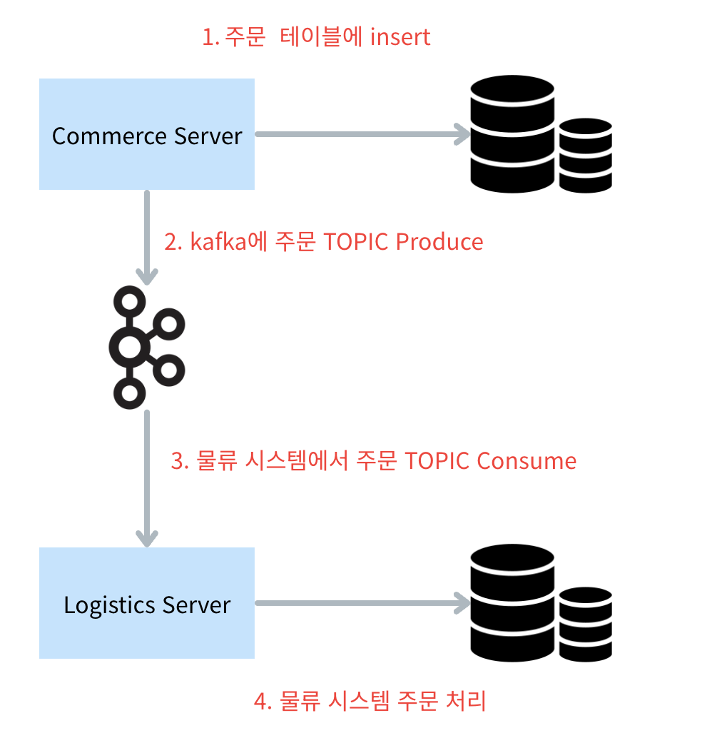 예를 들어, 커머스시스템과 물류시스템이 분리되어 있고 아래와 같은 프로세스로 수행된다고 하자. (원래라면 더 세부적인 도메인 별로 서비스가 쪼개져 있겠지만 이해를 쉽게 두개로만 분리해 보자.)